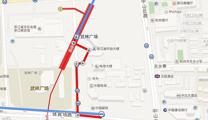 在机场大巴处购买至杭州市区的机场大巴车票,行至武林门民航售票处站下车,步行490米至21路市府大楼站上车(如图红色路线)