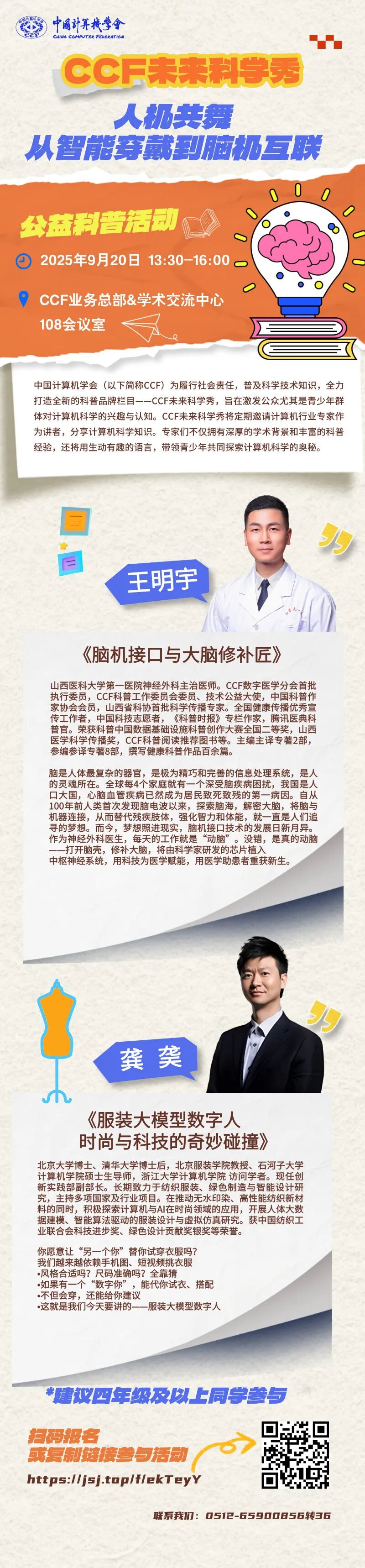 福利:选中的小朋友将获得CCF实践证书+专属纪念品,还能在展厅“上岗”,成为科学的“小传播官”!